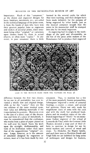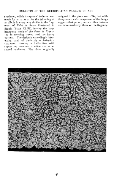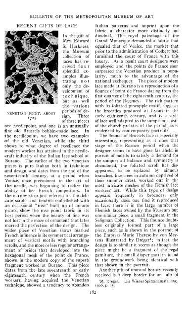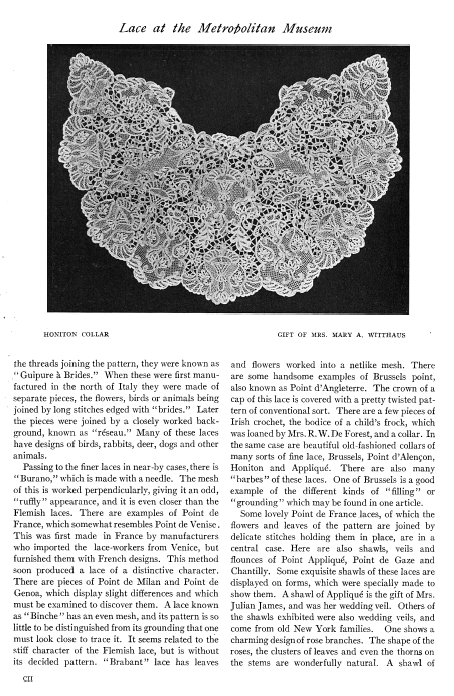 Recent Gifts of Lace, ---. Bulletin of the Metropolitan Museum of Art, 1913, 2 pages. Posted May 11, 2005. SAMPLE PAGE. File size 748 KB PDF
