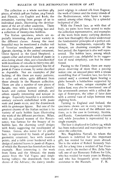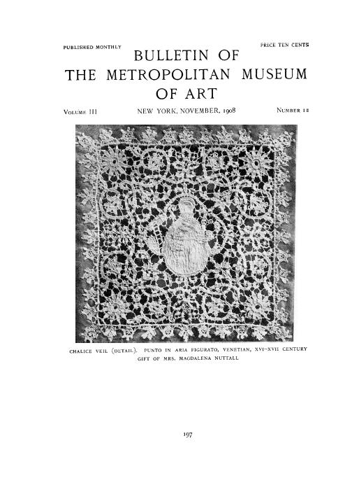 A Collection of Lace Presented by Mrs. Magdalena Nuttall, ---. Bulletin of the Metropolitan Museum of Art, 1908, 2 pages. Posted May 4, 2005. SAMPLE PAGE. File size 512 KB PDF