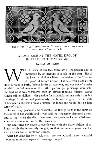 Lace Sale at the Hotel Drouot in Paris, in the Year 1882, Hague, Marian. The Bulletin of the Needle and Bobbin Club, Vol. 3 (1919), 4 pages. Note: Scanned images provided by Tess Parrish. Posted March 19, 2004. CD (LDA04). SAMPLE PAGE. File size 620 KB PDF