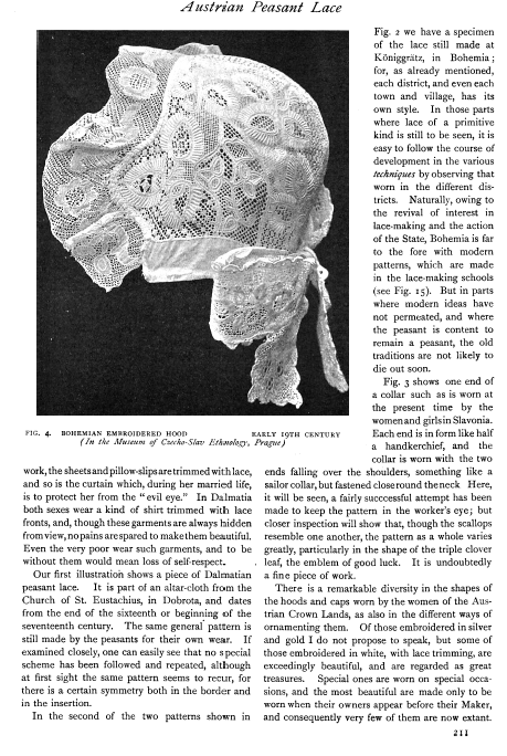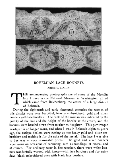 Bohemian Lace Bonnets, Mahin, Abbie C. The Bulletin of the Needle and Bobbin Club, Vol. 4 (1920), 3 pages. Posted March 19, 2004. CD (LDA04). SAMPLE PAGE. File size 884 KB PDF