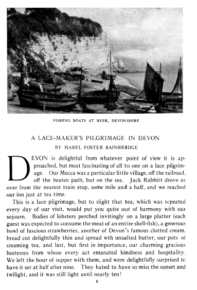Lace-Maker's Pilgrimage in Devon, Bainbridge, Mabel Foster. The Bulletin of the Needle and Bobbin Club, Vol. 5, No. 2 (1921), 6 pages. Note: Scanned images provided by Tess Parrish. Posted February 15, 2004. SAMPLE PAGE. File size 896 KB PDF