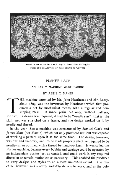 Pusher Lace: An Early American Machine-Made Fabric, Mahin, Abbie C. The Bulletin of the Needle and Bobbin Club, Vol. 6 (1922), 5 pages. Posted December 14, 2003. CD (LDA04). SAMPLE PAGE. File size 1.2 MB PDF