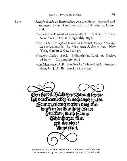 List of Pattern Books for Lace and Embroidery in the Metropolitan Museum of Art, ---. The Bulletin of the Needle and Bobbin Club, Vol. 17, No. 2 (1933), 9 pages. Posted October 1, 2003. CD (LDA04). SAMPLE PAGE. File size 740 KB PDF