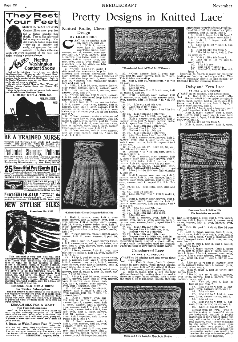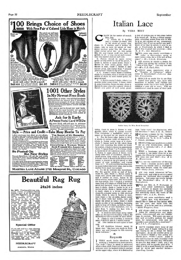 Irish Crochet Lace. No. 21, 16 pages. Note: Reduced to 85% to fit on page. Posted September 13, 2004. File size 4.2 MB PDF