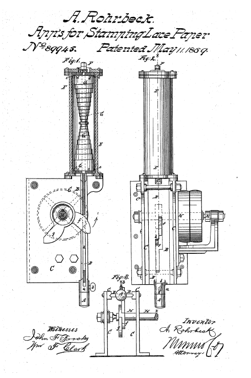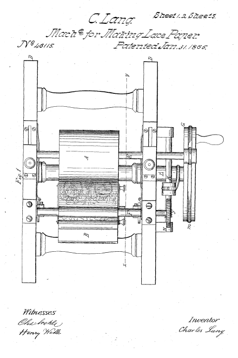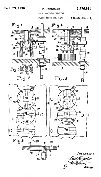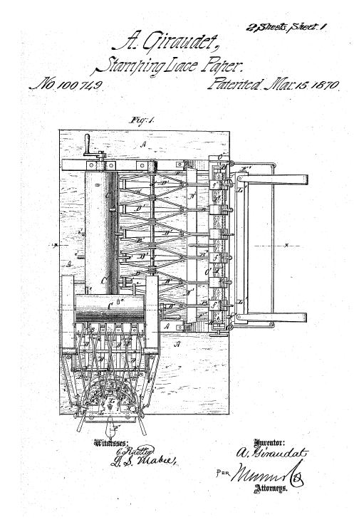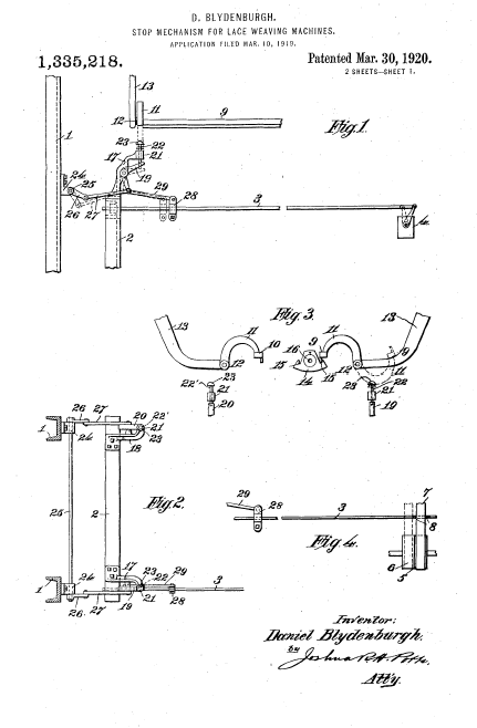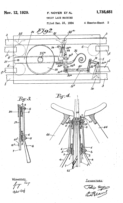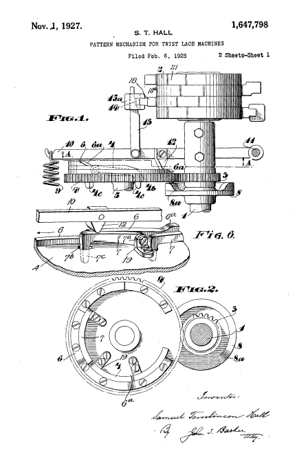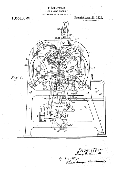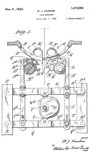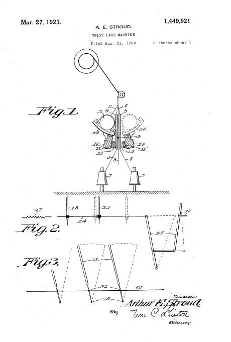Twist Lace Machine, US01449921, Stroud, A. E.. March 27, 1923, 4 pages. Posted January 22, 2005. SAMPLE PAGE. File size 604 KB PDF