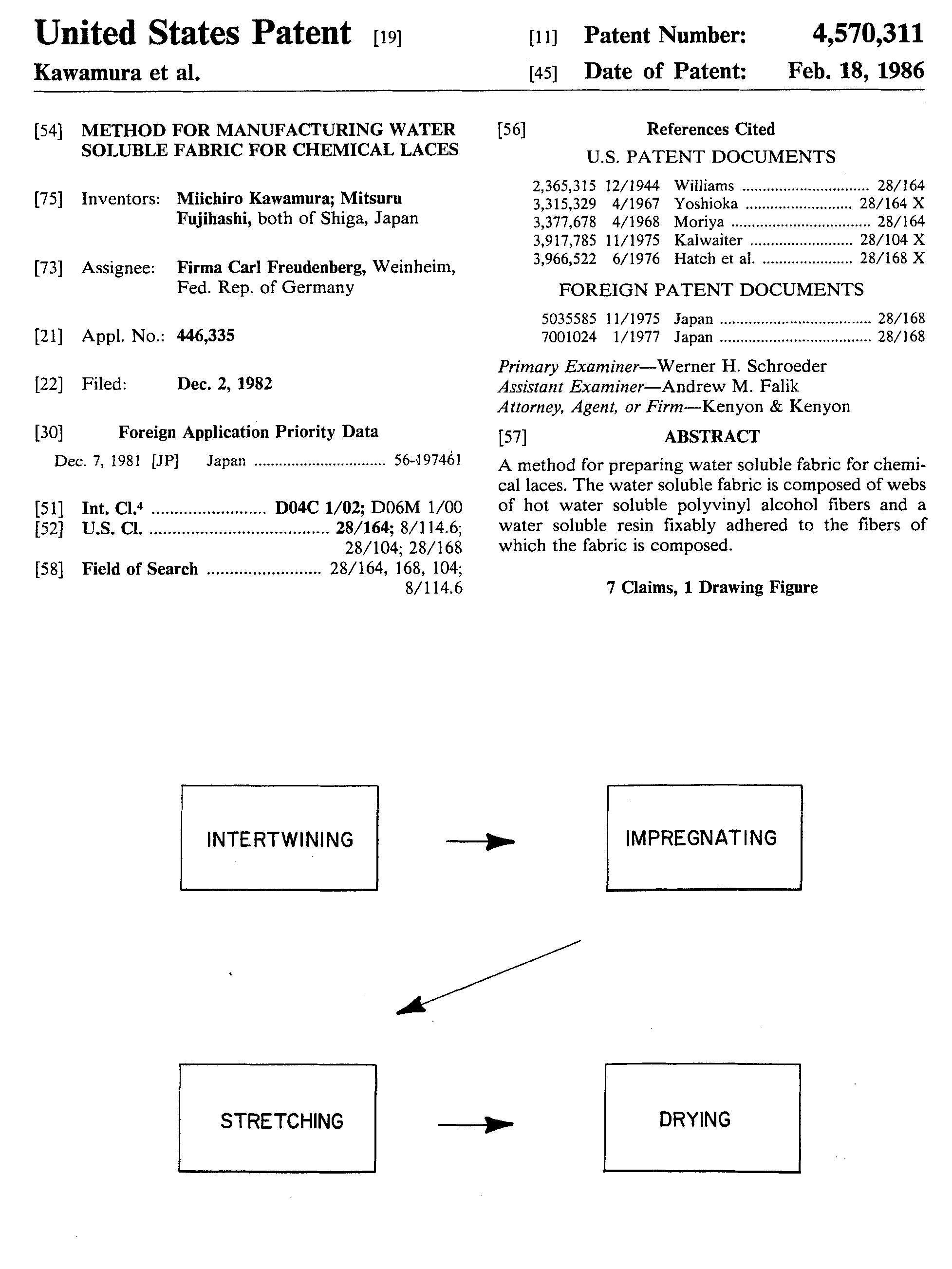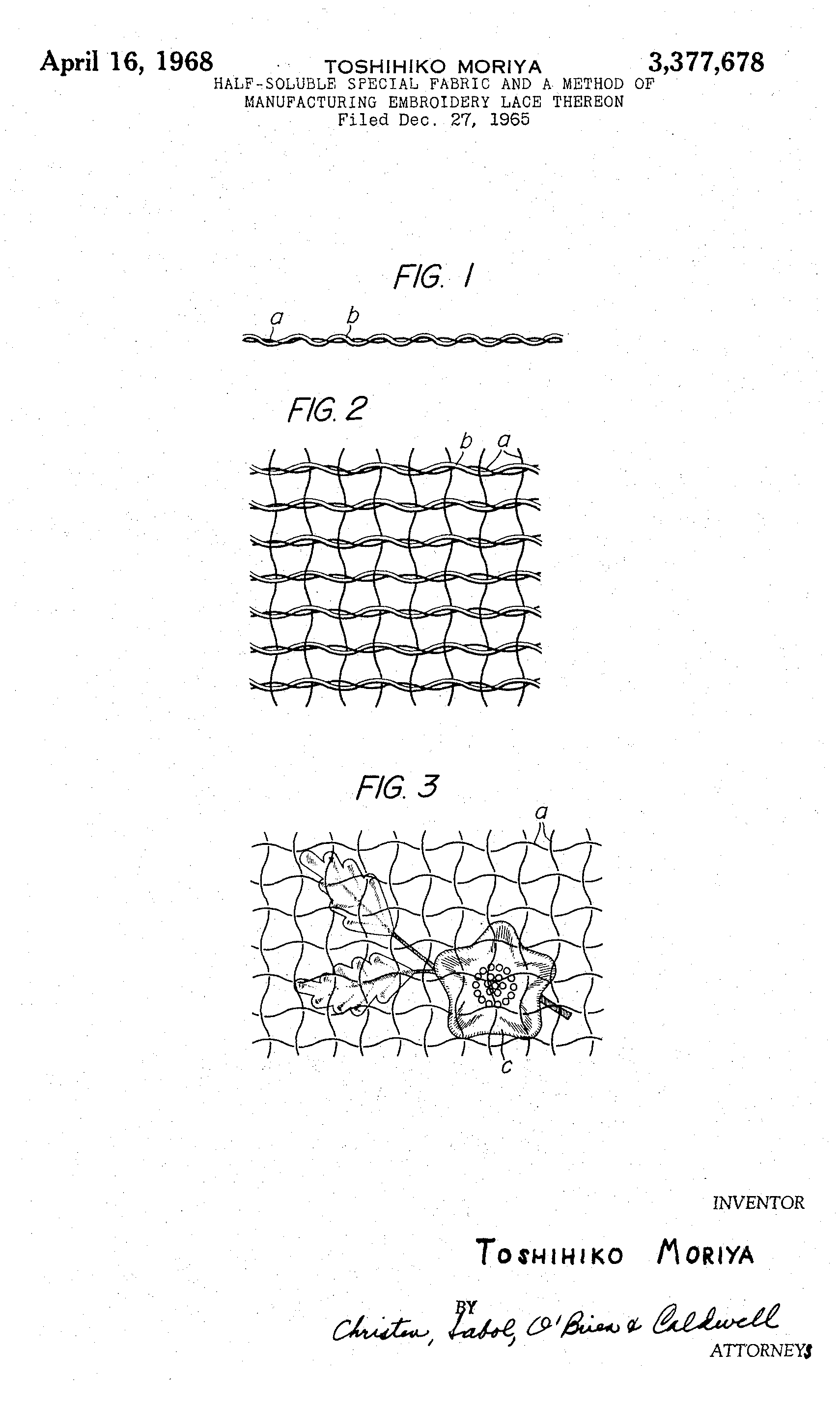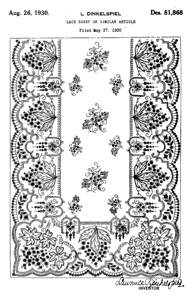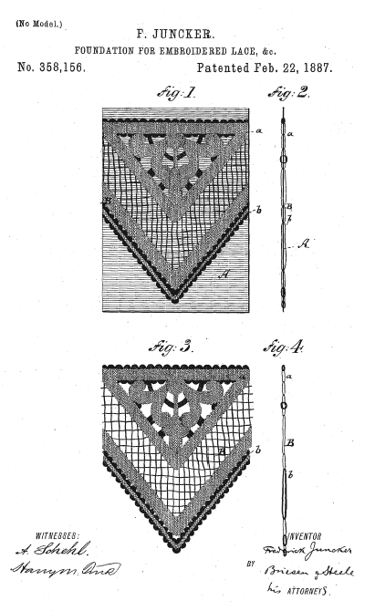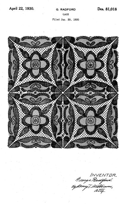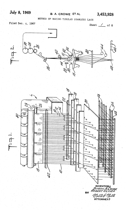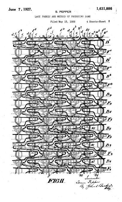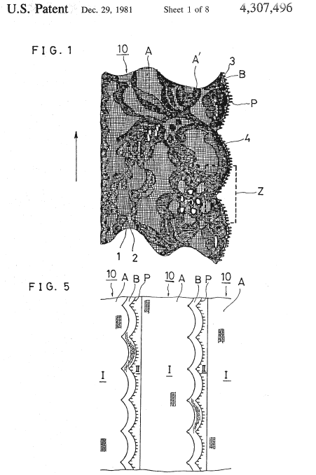 Warp-Knitted Lace Strip, Material Fabric, and Manufacturing Method Thereof, US04307496, Nakagaki, Noboru and Yoyu Fujikawa. December 29, 1981, 16 pages. Posted August 20, 2002. CD (LDA01). CD (HWDA10). SAMPLE PAGE. File size 1.2 MB PDF