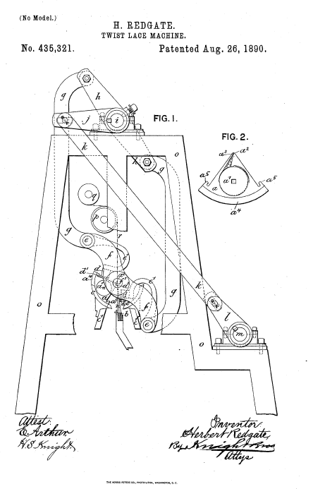Twist Lace machine, US00435321, Redgate, H.. August 36, 1890, 3 pages. Posted June 27, 2003. CD (HWDA10). CD (LDA02). SAMPLE PAGE. File size 552 KB PDF