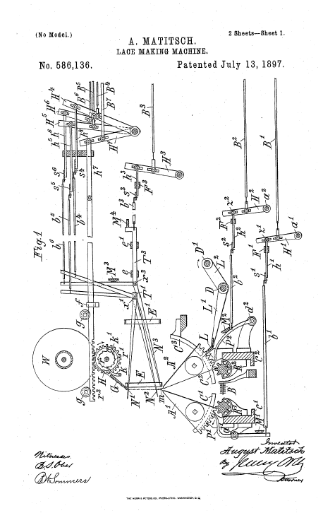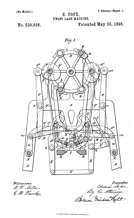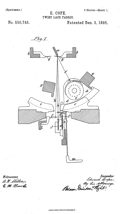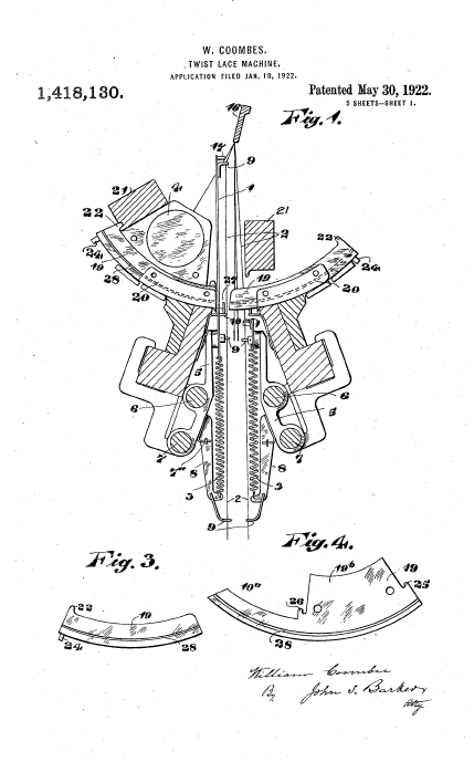 Twist Lace Machine, US01418130, Coombes, W.. May 30, 1922, 10 pages. Posted January 22, 2005. SAMPLE PAGE. File size 1 MB PDF