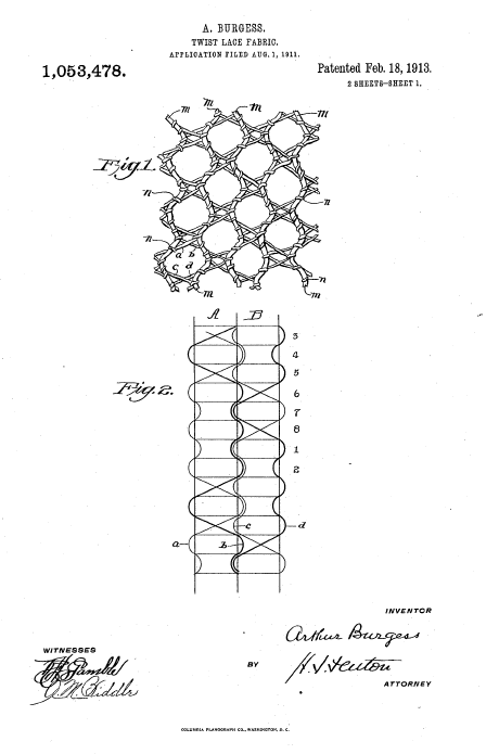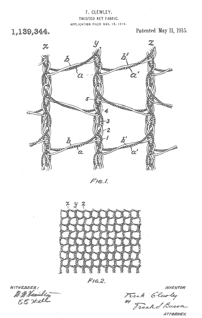Twisted Net Fabric, US01139344, Clewley, F.. May 19, 1915, 12 pages. Posted August 20, 2002. CD (LDA01). CD (HWDA10). SAMPLE PAGE. File size 596 KB PDF