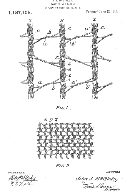 Twisted Net Fabric, US01187158, McGinley, J. J.. June 13, 1916, 4 pages. Posted August 20, 2002. CD (LDA01). CD (HWDA10). SAMPLE PAGE. File size 708 KB PDF