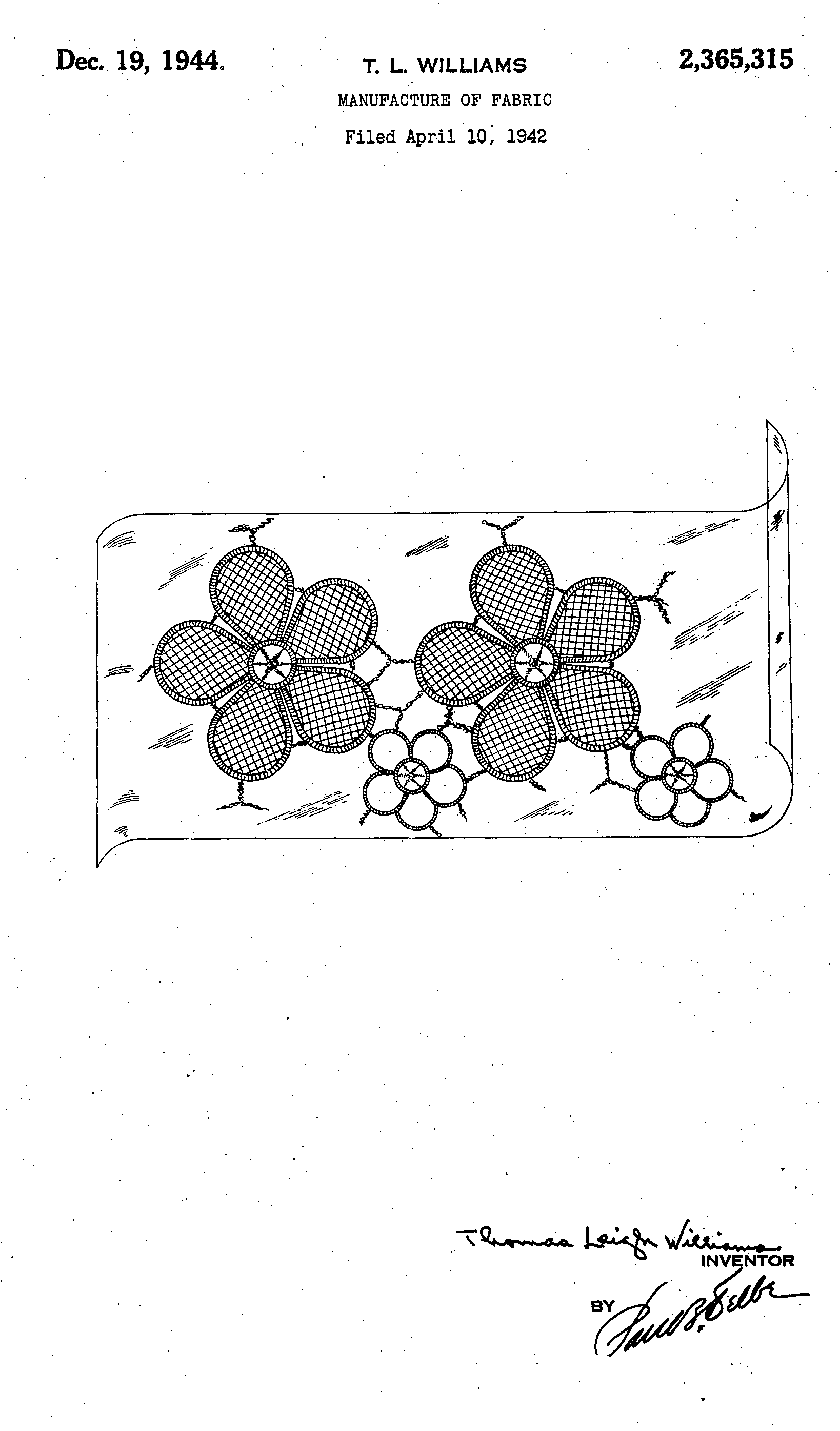 Manufacture of Fabric, US02365315, Williams, T. L.. December 19, 1944, 4 pages. Posted October 8, 2002. CD (LDA01). CD (HWDA10). SAMPLE PAGE. File size 1.6 MB PDF
