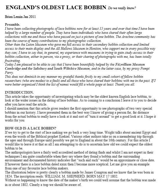 Lemin, Brian. England's Oldest Lace Bobbin. Do We Really Know ?, 8 pages. Posted February 17, 2011. FIRST PAGE. File size 896KB PDF