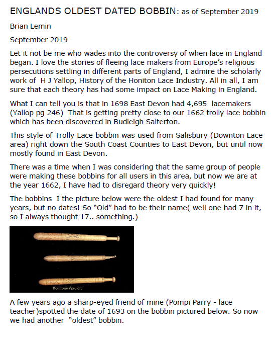 Lemin, Brian. Englands Oldest Dated Bobbin, 5 pages. Posted October 27, 2019. FIRST PAGE. File size 380 KB PDF