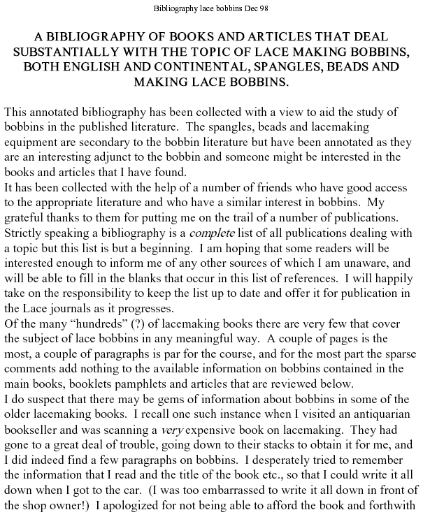 Lemin, Brian. A Bibliography of Books and Articles that Deal Substantially with the Topic of Lace Making Bobbins, 11 pages. Posted June 5, 2003. FIRST PAGE. File size 116 KB PDF