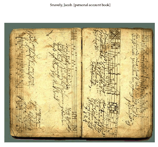 Snavely, Jacob. [personal account book], 51 pages. Note: Selected pages. Posted March 13, 2000. CD (CWDA02). SAMPLE PAGE. File size 3.8 MB PDF
