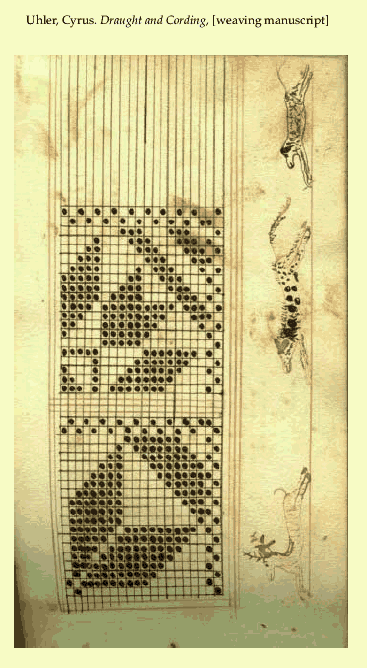 Uhler, Cyrus. Draught and Cording [weaving manuscript], ca 1830, 107 pages. Note: Landscape mode. Posted May 14, 2001. CD (CWDA02). SAMPLE PAGE. File size 6.0 MB PDF