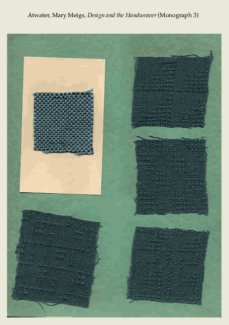 Atwater, Mary Meigs. Design and the Handweaver Portfolio, Shuttle Craft, 1961, 3 pages. Note: Accompaniment to Shuttle Craft Monograph 3. Posted September 17, 2000. SAMPLE PAGE. File size 1.3 MB PDF