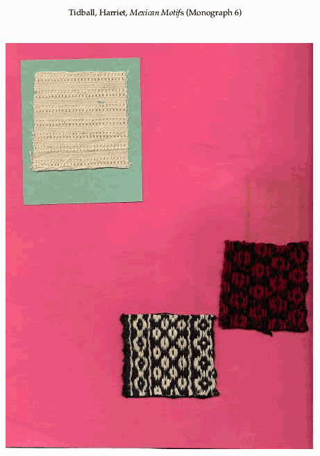 Tidball, Harriet. Mexican Motifs Portfolio, Shuttle Craft, 1962, 5 pages. Note: Accompaniment to Shuttle Craft Monograph 6. Posted September 17, 2000. SAMPLE PAGE. File size 1.5 MB PDF