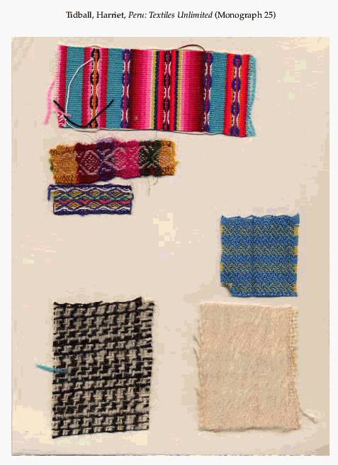 Tidball, Harriet. Peru: Textiles Unlimited Portfolio, Shuttle Craft, 1968, 5 pages. Note: Accompaniment to Shuttle Craft Monograph 25. Posted September 17, 2000. SAMPLE PAGE. File size 2.5 MB PDF