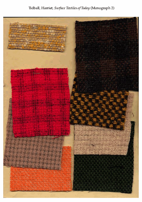 Tidball, Harriet. Surface Textiles of Today Portfolio, Shuttle Craft, 1961, 3 pages. Note: Accompaniment to Shuttle Craft Monograph 2. Posted September 17, 2000. SAMPLE PAGE. File size 5.5 MB PDF