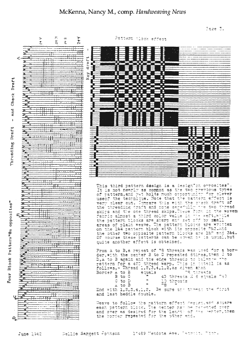 McKenna, Nancy M., compiler. Handweaving News, self published, 2000, 303 pages. Note: Writings of Nellie Sargent Johnson. Posted August 29, 2001. SAMPLE PAGE. Part 1: File size 10.9 MB PDF. Part 2: File size 11.7 MB PDF. Part 3: File size 10.5 MB PDF.