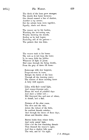 Bittinder, J. B. The Weaver, Atlantic Monthly, Vol. 36 (1885), 2 pages. CD (HWDA08). Posted January 19, 2004. SAMPLE PAGE. File size 568 KB PDF