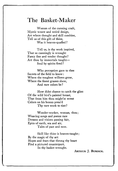 Burdick, Arthur J. The Basket-Maker, Craftsman, Vol. 9 (1905), 1 page. CD (HWDA09). Posted September 19, 2003. SAMPLE PAGE. File size 412 KB PDF