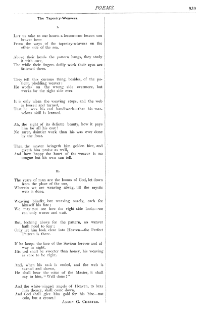 Chester, Anson G. The Tapestry-Weavers, Scribners, Vol. 22 (1881), 1 page. CD (HWDA08). Posted January 19, 2004. SAMPLE PAGE. File size 560 KB PDF