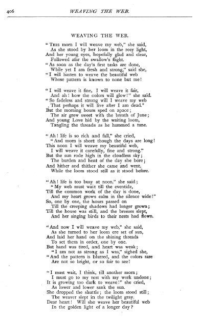 Dorr, Julia C. R. Weaving the Web, Scribners, Vol. 16 (1878), 1 page. CD (HWDA08). Posted January 19, 2004. SAMPLE PAGE. File size 496 KB PDF