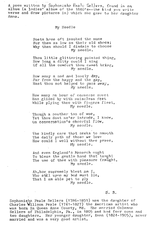 Sellers, Sophonisba Peale. My Needle, 1 page. Note: Provided by Tess Parrish. CD (HWDA11). Posted October 4, 2004. SAMPLE PAGE. File size 436 KB PDF