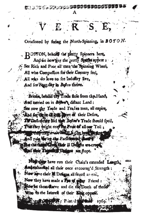 ---. A Verse, Occasioned by Seeing the North-Spinning in Boton (sic), 1769, 1 page. Posted April 21, 2006. SAMPLE PAGE. File size 84 KB PDF