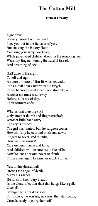 Ernest Crosby. Cotton Mill, Broad-Cast, 1905, 3 pages. CD (HWDA09). Posted November 3, 2003. SAMPLE PAGE. File size 12 KB PDF