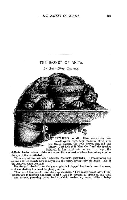 Channing, Grace Ellery. The Basket of Anita, Scribner's Magazine, Vol. 8, No. 2 (August 1890), 11 pages. CD (HWDA11). Posted October 6, 2004. SAMPLE PAGE. File size 3 MB PDF