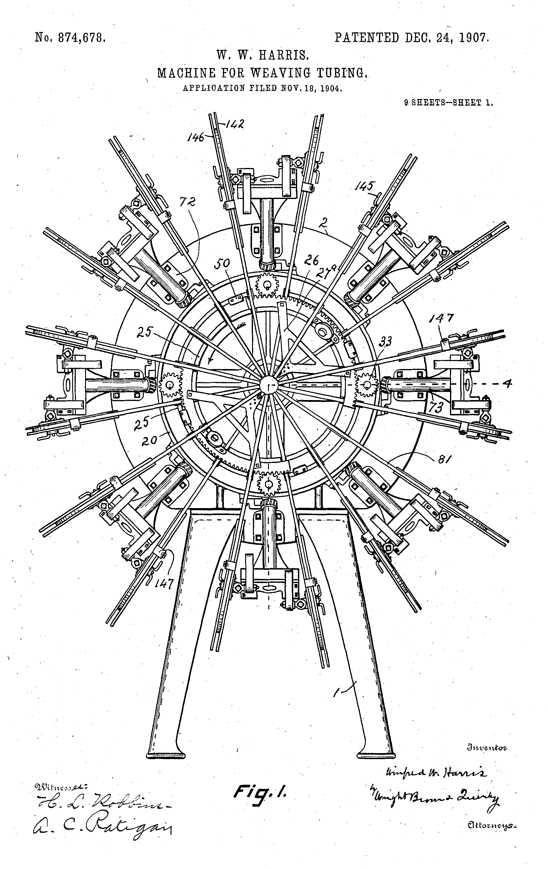 Machine for Weaving Tubing, US00874678, Harris, W. W., December 24, 1907, 13 pages. Posted October 8, 2002. CD (HWDA10). SAMPLE PAGE. File size 1.1 MB PDF