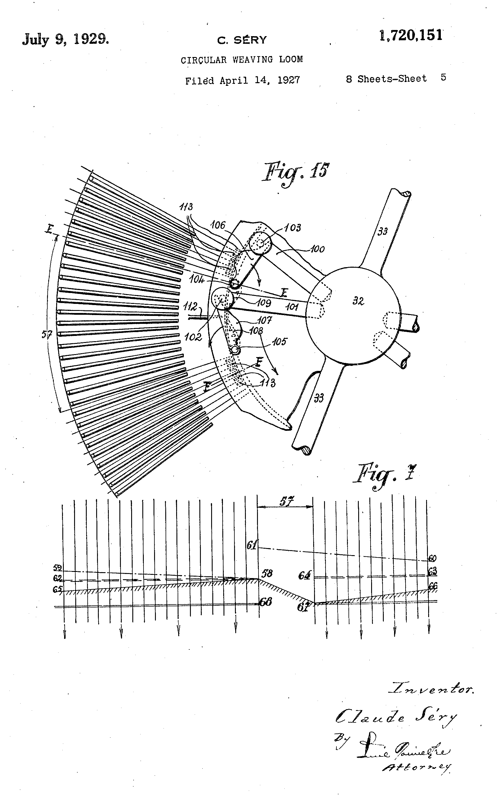 Circular Weaving Loom, US01720151, Sery, C., July 9, 1929, 14 pages. Posted October 30, 2002. CD (HWDA10). SAMPLE PAGE. File size 1.3 MB PDF