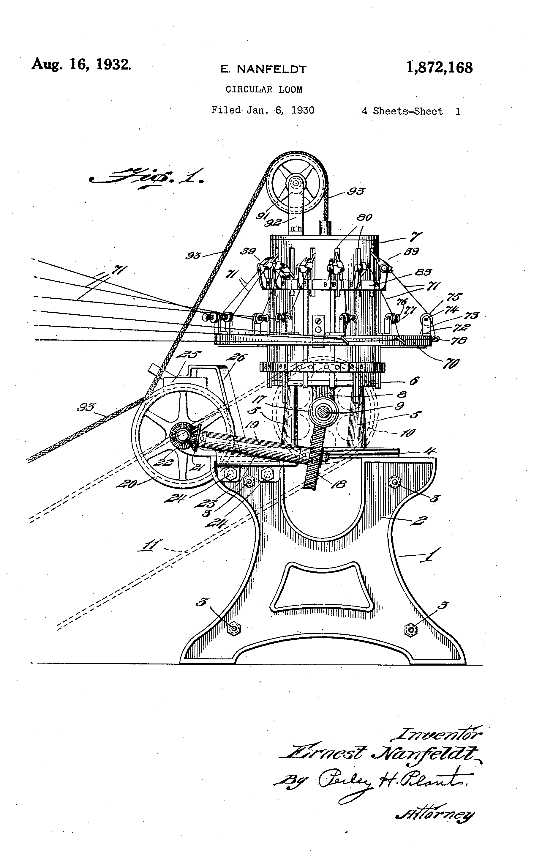 Circular Loom, US01872168, Nanfeldt, E., January 6, 1930, 11 pages. Posted October 8, 2002. CD (HWDA10). SAMPLE PAGE. File size 1.3 MB PDF