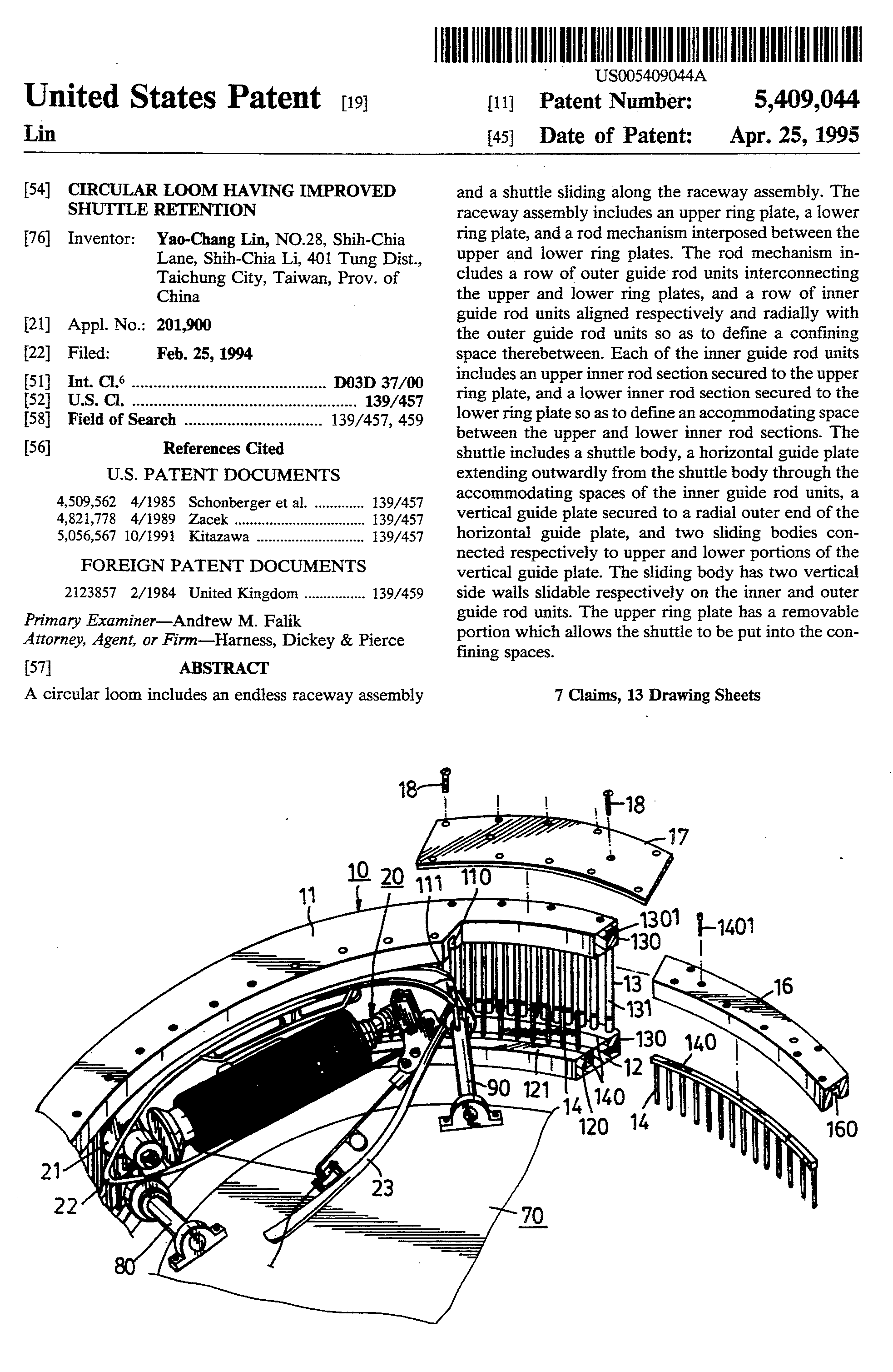 Circular Loom having Improved Shuttle Retention, US05409044, Lin, Yao-Chang, April 25, 1995, 23 pages. Posted October 8, 2002. CD (HWDA10). SAMPLE PAGE. File size 1.2 MB PDF