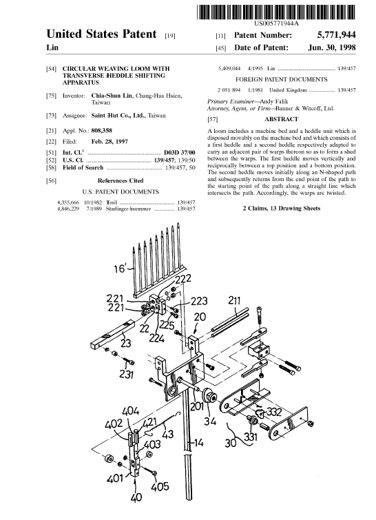 Circular Weaving Loom with Transverse Heddle Shifting Apparatus, US05771944, Lin, Chia-Shun, June 30, 1998, 9 pages. Posted October 8, 2002. CD (HWDA10). SAMPLE PAGE. File size 544 KB PDF