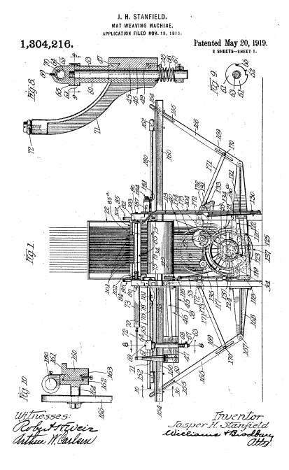 Mat Weaving Machine, US01304216, Stanfield, J. H., May 20, 1919, 16 pages. Posted October 8, 2002. CD (HWDA10). SAMPLE PAGE. File size 1.7 MB PDF
