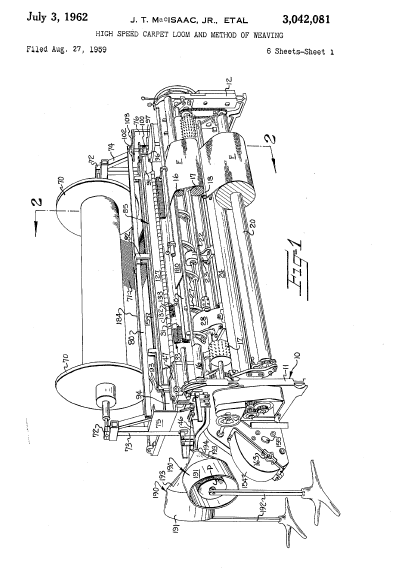 High Speed Carpet Loom and Method of Weaving, US03042081, MacIsaac, J. T. Jr., August 27, 1959, 14 pages. Posted September 20, 2002. CD (HWDA10). SAMPLE PAGE. File size 1.2 MB PDF