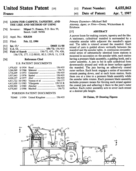 Loom for Carpets, Tapestry, and the Like and Method of Using, US04655863, Franco, Miguel V., April 7, 1987, 37 pages. Posted March 2, 2003. CD (HWDA10). SAMPLE PAGE. File size 1.7 MB PDF