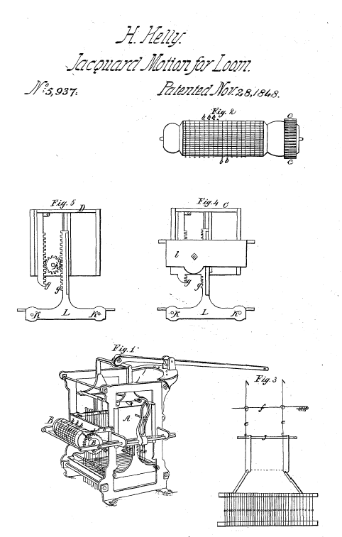 Jacquard Motion for Loom, US00005937, Kelly. H., November 28, 1848, 3 pages. Posted January 2, 2004. CD (HWDA10). SAMPLE PAGE. File size 564 KB PDF