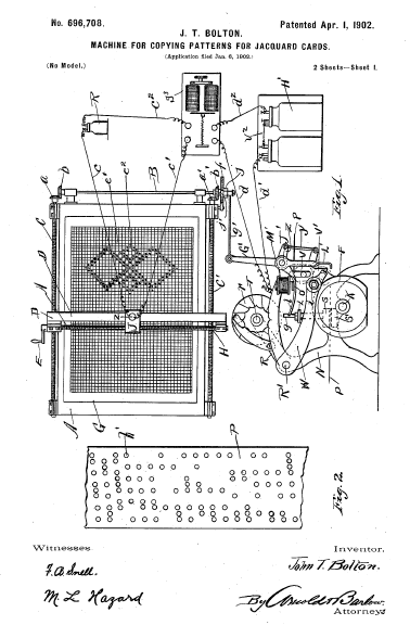 Machine for Copying Patterns for Jacquard Cards, US00696708, Bolton, J. T., April 1, 1902, 5 pages. Posted March 5, 2002. CD (HWDA10). SAMPLE PAGE. File size 352 KB PDF