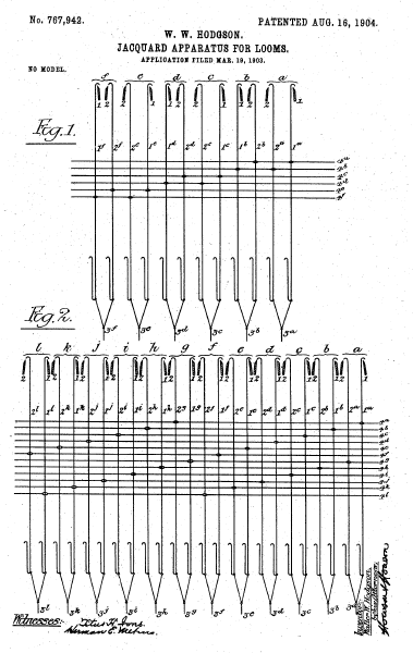 Jacquard Apparatus for Looms, US00767942, Hodgson, W. W., August 16, 1904, 3 pages. Posted March 5, 2002. CD (HWDA10). SAMPLE PAGE. File size 196 KB PDF