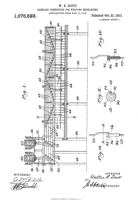 Jacquard Connection for Weaving Mechanisms, US01076523, Scott, W. R., October 21, 1913, 11 pages. Posted January 22, 2005. SAMPLE PAGE. File size 1.3 MB PDF