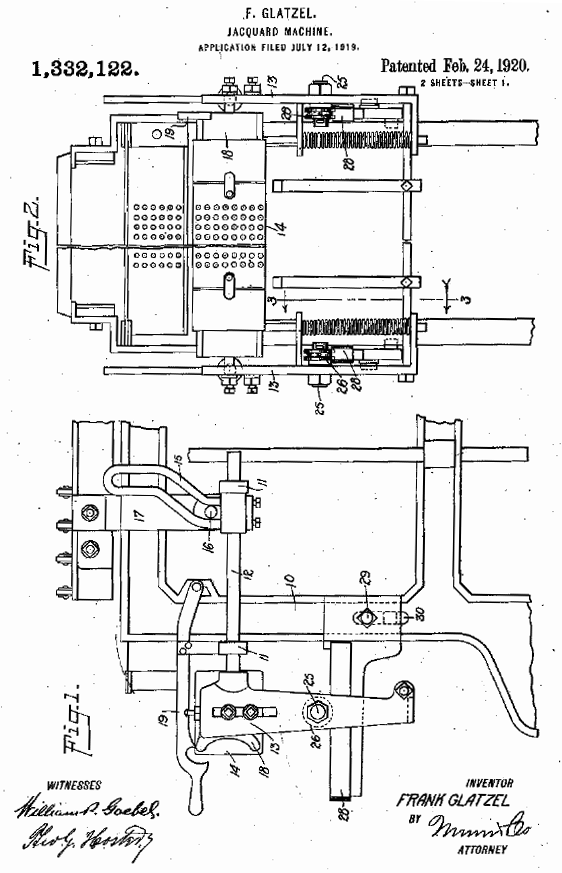 Jacquard Machine, US01332122, Glatzel, F., February 24, 1920, 4 pages. Posted October 30, 2002. CD (HWDA10). SAMPLE PAGE. File size 676 KB PDF