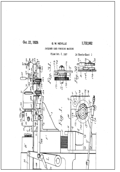 Jacquard Card Punching Machine, US01732982, Neville, G. W., October 3, 1927, 1 page. Posted March 5, 2002. CD (HWDA10). SAMPLE PAGE. File size 56 KB PDF