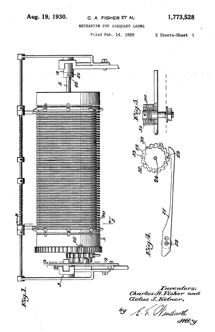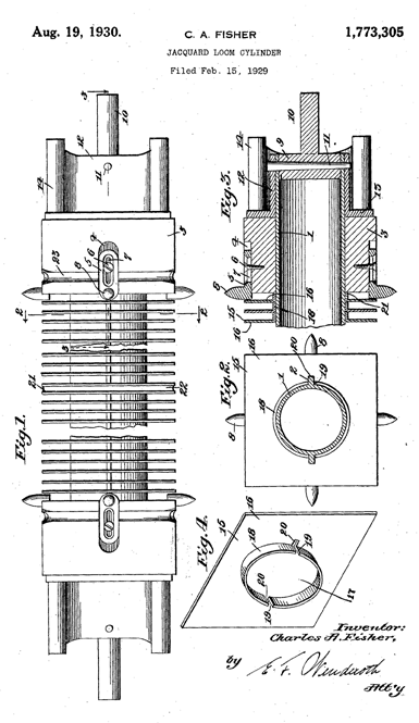 Jacquard Loom Cylinder, US01773305, Fisher, C. A., August 19, 1930, 5 pages. Posted October 30, 2002. CD (HWDA10). SAMPLE PAGE. File size 1 MB PDF