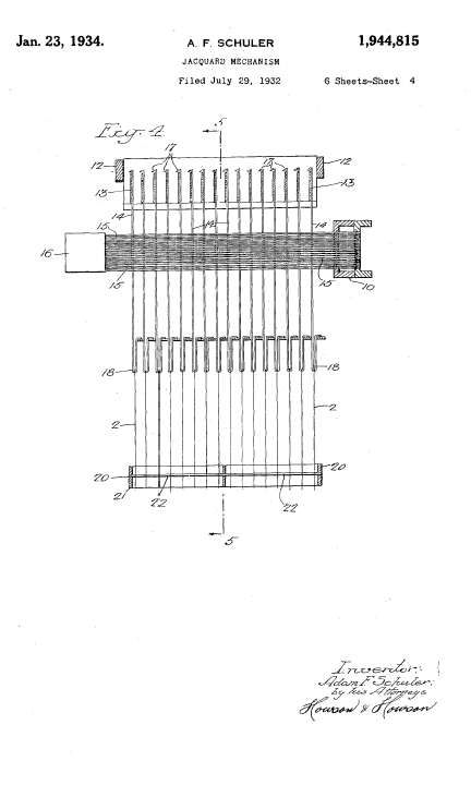 Jacquard Mechanism, US01944815, Schuler, A. F., July 29, 1932, 10 pages. Posted February 9, 2005. SAMPLE PAGE. File size 1 MB PDF