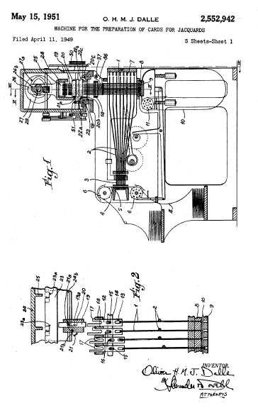Machine for the Preparation of Cards for Jacquards, US02552942, Dalle, O. H. M. J., May 15, 1951, 11 pages. Posted March 5, 2002. CD (HWDA10). SAMPLE PAGE. File size 992 KB PDF